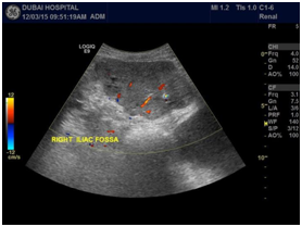 Figure 1a&1b: Old Transplanted kidney in the right iliac fossa shows a large hypoechoeic solid lobulated mass measuring 10.0x6.9cm with increased vascularity on Doppler.