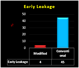 Leakage of PD fluid is a major noninfectious complication reported in percutaneous method, with a reported frequency as high as 12.8 %.20 Whereas in our study modification of implantation technique led to dramatic reduction in incidence of early leak (within 30 days of catheter implantation) to 4.17% v/s 44.89% in conventional method as well as late leak (after 30 days of implantation) found in 2.08% v/s 51.02% which suggests that minimizing the size of incision and dissection can lead to better outcomes. Conservative means (change to IPD, observation) were applied for the management of late leaks.