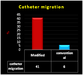 Drainage failure: Mechanical factors are a major cause of PD catheter malfunction, manifesting as insufficient inflow and/or outflow of dialysate. At the subcutaneous level, kinking of the tubing can lead to slow dialysate flow (including the inflow and outflow rate). Inside the peritoneum, bowel trapping (mostly owing to constipation), omental wrapping, and ensnaring by adhesions, epiploic appendices, or uterine tubes can result in outflow failure (drainage volume being significantly less than the inflow volume). Within the catheter lumen, blood clots or fibrin can lead to slow inflow and outflow rates. In our study outflow problems were seen in 26/49 (53.06 %) patients in Conventional and 3/48 (6.25%) in M method (P value <0.05) ,even in the presence of more migration episodes but still better PD catheter survival and CAPD duration, suggestive of better methodology while it was reported by various studies between1.5 % to 34.7%.22 Type of catheter may also influence the better outcomes in our study as curl Catheter was used in modified method which may have led to better catheter survival and lesser drainage problems even with higher episodes of migration.
