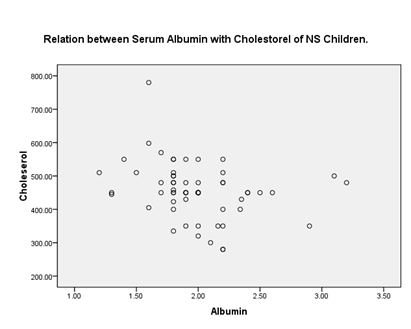 A total of 60 nephrotic syndrome children were recruited to this study. The mean albumin level in was 1.88(±.37) g/dl. The mean cholesterol level was 240(±07) mg/dl. Interpretation: Negative correlation (r=-0.27) and since p-value=0.03 <0.05, at 5% level of sig. the test is significant. So we can say significant correlation exist between albumin and cholesterol of NS Children.
