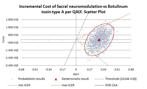 Results: SNM obtained 5.67 QALYs vs. 5.38 with BoNT-A with 0.28 incremental QALYs, with US$27,828 vs. US$28,906 total costs respectively. SNM was more effective and less costly, therefore been cost-saving. In the Probabilistic Sensitivity analysis 49.1% of the simulations fall in the NE quadrant, more effective and more costly, and 50.9% in the SE quadrant, more effective and less costly than BoNT-A, and 100% fall under the threshold of 3 Colombian GDP Per Capita.