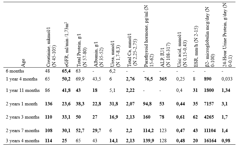 For the first time, at the age of 1 year 4 months, the girl was hospitalized in the nephrology department of the Institute. On examination, the weight is 10 kg (less than 3%), height 79 cm (50-75%), increased blood pressure (BP) by one-time measurements (above 95%). The examination revealed a glomerular function decrease (creatinine 65 mmol/l; eGFR 50 ml/min / 1.73 m2), hypercalcemia (Ca – 2.76 mmol/L), alkaline phosphatase in normal (alkaline phosphatase - 365 IU/L), signs of moderate secondary hyperparathyroidism (PTH – 76.5 pg/ml) and normal level of vitamin 25 (OH) D in the blood; no thyroid disorders were detected; according to the acid-base status, there are no metabolic disorders Table 1.