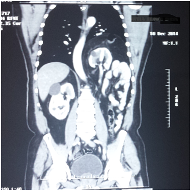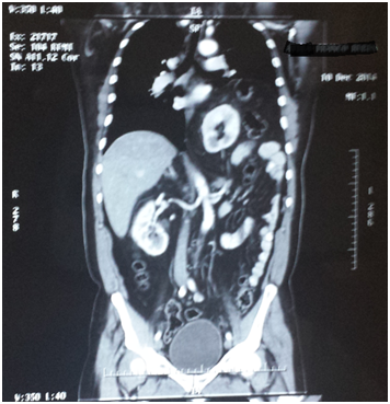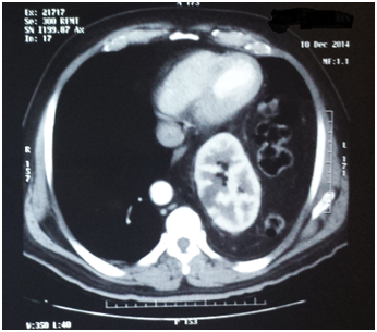 The patient attends the urology outpatient clinic because the previous week he had presented lumbar pain radiating to the right flank as well as the right iliac fossa, intermittent, without fever but with occasional constipation and flatulence. The patient attends to a private’s hospital ER and is prescribed with analgesics, however, 24hours later he presents a new pain condition and attends the same center and undergoes further complete laboratory tests that did not present any alterations. After a throaco abdominal Computerized Axial Tomography with contrast, the presence of intra thoracic ectopic kidney and left diaphragmatic hernia is observed and with a progress caused by the medical treatment administered in the hospital, the patient attends the Urology service due to the presence of left ectopic kidney. Upon arrival to the clinic, the asymptomatic patient does not show any urological pathology and turns out with normal laboratory results (Figure 1-4).