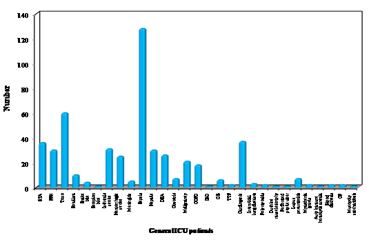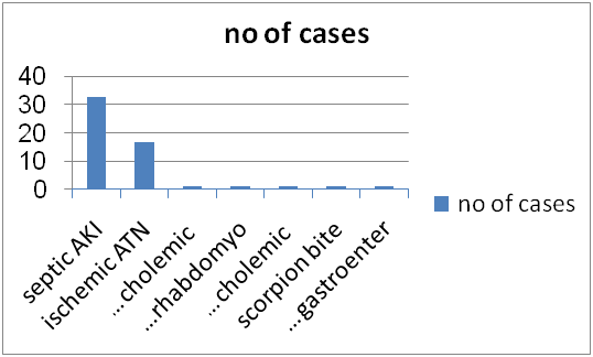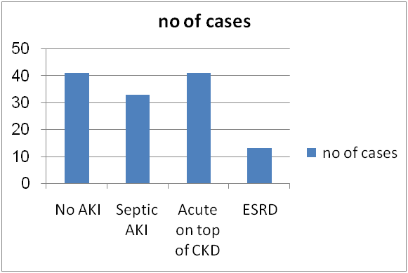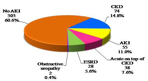 Our study included 500 General ICU patients (classified according to renal impairment) (Figure 1) 303 no AKI (60.6%), 74 CKD (14.8%), 55 AKI (11%), 38 acute on top of CKD (7.6%), 28 ESRD (5.6%), 2 obstructive uropathy (0.4%) and Classified according to cause of admission (Figurse 2) RTA 36 cases, Fall from height 30 cases, Toxo 60 cases, Botulism 10 cases, Snake bite 4 cases, Scorpion bite 1 case, Ischemic stroke 31 cases, Hemorrhagic stroke 25 cases, Meningitis 5 cases, Sepsis 128 cases, Hepatic 30 cases, DKA 26 cases, Obstetric 7 cases, Malignancy 21 cases, COPD 18 cases, IBD 1 case, GB 6 cases, TTP 2 cases, Cardiogenic 37 cases, Interstitial lung diseases 3 cases, Polymyositis 2 cases, Duchine muscle atrophy 1 case, Perforated peptic ulcer 1 case, Lupus pneumonitis 7 cases ,Myasthenia gravis 2 cases, Auto immune hemolytic anemia 1 case, Blood diathesis 2 cases, CP 2 cases, Mucopolysaccharidosis 1 case.