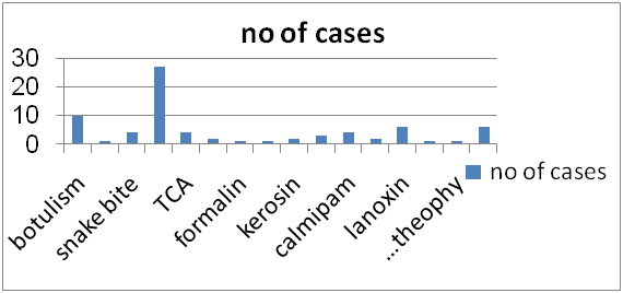 Toxicological cases (75 cases) classified in to: Botulism 10 cases, Scorpion bite 1 case (developed AKI), Snake bite 4 cases, Organo phosphorus 27 cases (2 developed AKI), Tricyclic antidepressant (TCA) 4 cases, Tegretol 2 cases, Formalin 1 case, Depakin 1 case, Kerosin 2 cases, Zn phosphate 3 cases, Calmipam 4 cases, Insulin 2 cases, Lanoxin 6 cases, Tamol 1 case, Theophylline 1 case, Methanol 6 cases. Distribution of AKI in general ICU according to sex: Male patients 29/55 (52.7%) Female patients 26/55 (47.3%) & age distribution was (18-85y). 10 patients need dialysis 6 of them recovered & 4 of them died.