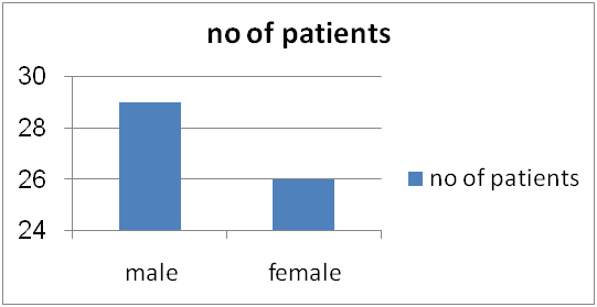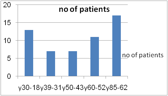 Toxicological cases (75 cases) classified in to: (Figure 3) Botulism 10 cases, Scorpion bite 1 case (developed AKI), Snake bite 4 cases, Organo phosphorus 27 cases (2 developed AKI), Tricyclic antidepressant (TCA) 4 cases, Tegretol 2 cases, Formalin 1 case, Depakin 1 case, Kerosin 2 cases, Zn phosphate 3 cases, Calmipam 4 cases, Insulin for suiscidal purpose 2 cases, Lanoxin 6 cases, Tamol 1 case, Theophylline 1 case, Methanol 6 cases Distribution of AKI in general ICU according to sex: (Figure 4) Male patients 29/55 (52.7%) Female patients 26/55 (47.3%). Distribution of AKI in general ICU according to age (Figure 5) (Table 3).