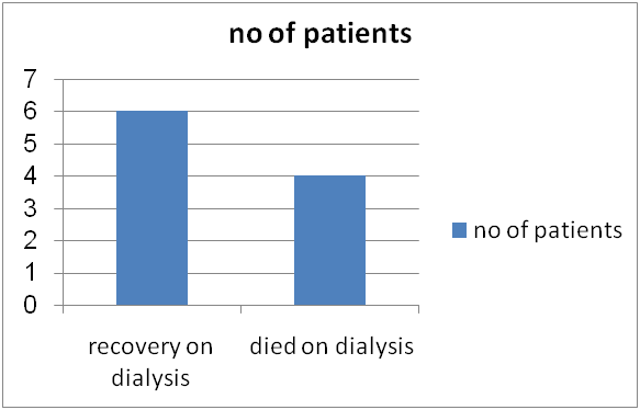 Mortality rate allover general ICU patients: 140/500 (28%). Mortality rate allover AKI patients in general ICU: 30/55 (54%). Fate of AKI general ICU patients on dialysis (Figure 7) 10 patients need dialysis 6 of them recovered & 4 of them died. Septic cases (128 cases) classified into: no AKI (32%), septic AKI (25.8%), (Figure 8) acute on top of CKD (32%), ESRD (10.2%) (Table 7).