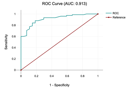 The ROC curve for the PRECE nomogram at one (1) mm showed a model AUC of 0.91 (95% CI) (Figure 1). Sensitivity was 96% and specificity was 44% with 95% of confidence interval (CI: 0.84-092). Chi2 was 74.62. The Chi square measures the difference between the observed and expected frequencies of the outcome of the model. 74.62 suggest that the model´s predictors have a significant relationship with the outcome. The Cox &Snell logistic regression analysis of the model was 0.31. This indicates the amount of variance in the dependence variable was explained by the model.