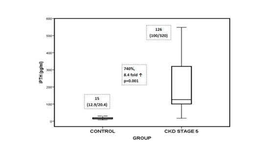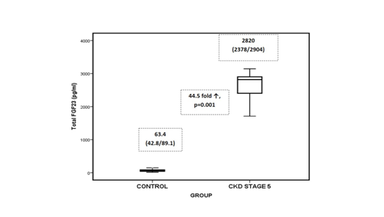 Conclusion: Marked accumulation of inactive C-terminal FGF-23 might provide new insights in understanding the role of FGF-23 and hyperphosphatemia in CKD stage-5 patients.