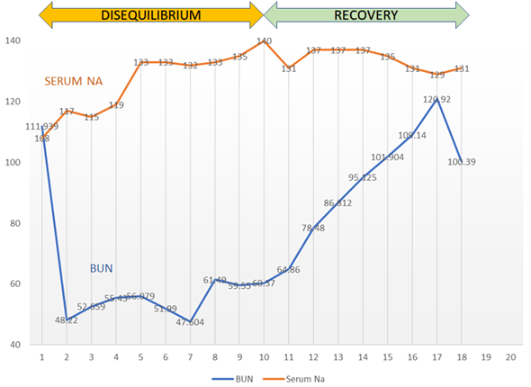 Immediate start of intravenous 3% sodium chloride 10 meq/hour for consecutive 4 hours aiming to reach the target of serum sodium 115 mmol/l in the first 24 hours to avoid rapid correction with serum sodium monitoring every 6 hours. Serum sodium reached 115 mmol/l then in the following 6 hours it was 119 mmol/l. Next day, patient suffer uremic manifestations of gastropathy in the form of nausea, vomiting and fluid overload in the form of shortness of breath with increase demand of oxygen. Urgent hemodialysis session was initiated. After hemodialysis session Laboratory investigations showed arterial blood gases: PH 7.4, HCO3 27.1 mmol/L, PCO2 37.9, BUN 48.2 mg/dl, serum creatinine 4.66 mg/dl , low serum potassium 3.0 mmol/l and serum sodium reached 133 mmol/l. Data representing the serial monitoring of sodium and BUN levels are shown in Figure 1. In the third day post hemodialysis, patient suffer sudden weakness of both legs associated with slurred speech, followed by disturbed conscious level. He was transferred to intensive care unit (ICU) because of the aggressive changes in conscious level and agitations.