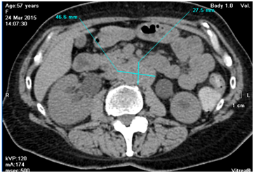 March 2015 she was admitted to urology clinic with her serum creatinine raised up to 450µmol/L, CT confirmed bilateral ureterohydronephrosis, and found right kidney enlargement and retroperitoneal mass with bilateral ureteral compression (Figure 1). She was diagnosed with retroperitoneal fibrosis, underwent right kidney percutaneous nephrostomy and left ureteral stenting, her creatinine lowered to 241µmol/L and she was referred to our clinic for further evaluation.