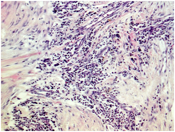 Figure 2 Light microscopy showing patchy perivascular, predominantly plasma cell infiltration in the fields of irregular fibrosis. (H&E, x 100.).