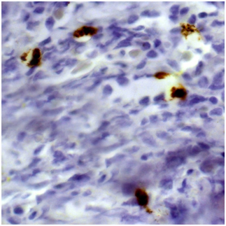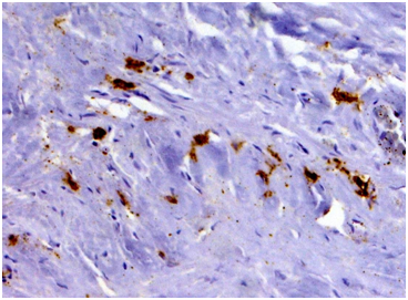Figure 3 Immunohistochemistry revealing patchy clusters of CD138-positive plasma cells in the fields of coarse fibrosis. (Immunoperoxidase, х 100.).