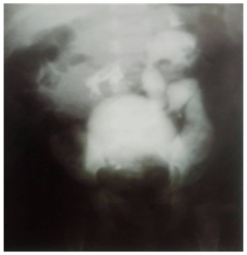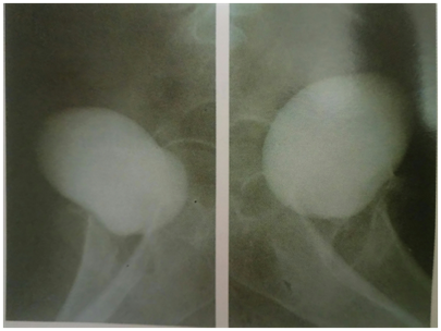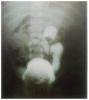 Three months later postoperative (IVU) was performed and showed normal functioning of both kidneys (Figure 4). Six months later; postoperative (MCUG) showed normal cystourethrogram except an active left sided VUR (First degree) which did not need further treatment (Figure 5A) (Figure 5B).1 In the last follow-up of the girl Sajida about 4 years ago when her age was15-year old, she was asymptomatic, active and healthy beautiful girl without any urological symptoms and we stopped follow-up because of normal exploration.