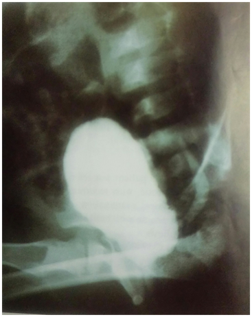 After one year of follow-ups, the opened cystostomy and marsupialization of the ureterocele, MCUG was performed and showed irregular wall of the urinary bladder, right sided (VUR), with severe tortuosity dilatation of the ureter and severe hydronephrotic changes in the collecting system of right kidney, with Lt secondary VUR (Figure 3).