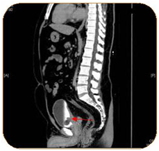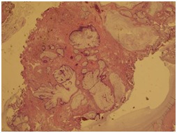 A complete blood count, liver function test, urine culture and PSA were all within normal ranges. Urine cytology revealed atypical cells. CT abdomen and pelvis with I.V contrast showed a 3.1 x 2.4 x 3 cm polypoidal mass of the trigone (Figure 1). Afterwards, the patient underwent cystoscopy which showed a solid florid mass extending from the trigone to the posterior wall of the urinary bladder, TURBT was carried out. The Histopathology slides showed cystitis cystica with cystitis glandularis (Colonic metaplasia) (Figure 2‒5).