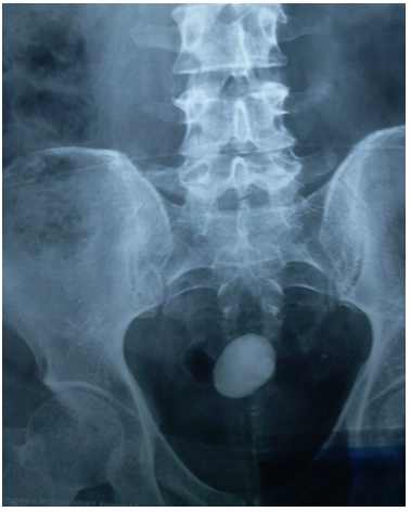 45 years old male patient came to urology outpatient complaining of recurrent right flank pain for several months, no fever or hematuria, no significant medical or surgical history. Physical examination was unremarkable, serum creatinin 1.1mg/dl , urine analysis showed microscopic hematuria, urine culture was negative, ultrasound reveals multiple right renal stones with dilated extrarenal pelvis, plain x ray & intravenous pyelography performed Figure1 (A & B). All treatment options explained to the patient and after discussion he elected to undergo laparoscopic peylolithotomy. Transperitoneal laparoscopic pyelolithotomy was performed in lateral position with Rt. Flank tilted 45 degrees using 4 ports. multiple renal pelvis and calyceal stones extracted and putted in a bag made of No 6 surgical glove (Figure 2) after closure of the pyelotomy by intracorporeal sutures the bag containing the stones extracted through the umbilical port after enlarging it (Figure 2), during extraction the bag was broken and some stones escaped to the abdomen. Another bag replaced and most of the stones extracted searching for the remaining stones in the abdomen was frustrating and we decided to terminate the procedure and closing the port sites. The post-operative course is unremarkable and patient discharged in fifth post-operative day. Follow up plain x-ray after one month revealed tow round stones with 30 and 10mm maximum diameter lying deep in the pelvis (Figure 3), after discussion with the patient about the possible complications of those stones he agree to underwent open extraction by low midline incision and stones extracted.
