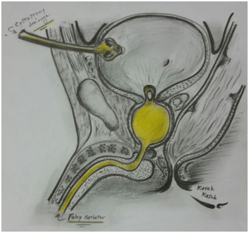 In our cases hemorrhage remained persistent despite the haemostatic Sutures, routine procedures for hemorrhage control and patients impeding to hypovolemic shock and required to massive transfusion protocol thus in transvesical prostatectomy cases 24 Fr Foley catheter balloon inflated up to 80 or 100 mL in prostatic fossa and in retropubic prostatectomy cases after closure of prostate capsule we did same (Figure 1). In all cases a suprapubic Malecot catheter was used as cystostomy to evacuate irrigation fluid entered the bladder via foley catheter lodged in the prostatic fossa. On the first or second post-operative day the balloon fluid was emptied gradually with no case of recurrent bleeding. The foley might then become repositioned out of the fossa into the bladder without any difficulty. The foley removed on the second or third post-operative day if urine was clear.