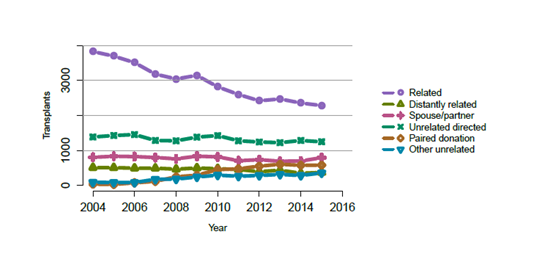 Living donors are classified into four main categories; the first is the genetically related donors such as the parents or a child of the recipient or from a haploidentical sibling. The second category includes emotionally related donors as spouses and friends. The third group includes altruistic donors. The last one includes a live-donor paired exchange. According to the OPTN/SRTR 2015 Annual Data Report, 5626 living donor transplants were performed, slightly up from 5539 in 2014 but well below the peak of 6647 in 2004. This decline appears to be due to a decrease in related kidney donations (Figure 1).9 Based on these facts, we need many efforts to enhance living donation. The adjusted 5-years allograft survival shows no statistically significant different between kidney transplant recipients who received their allografts from unrelated or related donors.10,11