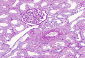 Figure 1A Light microscopy: The biopsy sample consists contain up to 21 glomeruli, 1 of them globally sclerosed. Glomerular basement membranes do not show thickening, spikes or vacuoles where tangentially cut. Adhesions, segmental sclerosis, hyalinosis, fibrin, necrosis or endocapillary proliferation or crescents are not seen. Tubular atrophy and interstitial scarring affect less than 5% of the cortex. Proximal tubular epithelium shows cytoplasmic vacuolation. Interstitium is free of inflammation. Seven interlobular arteries are included that show up to mild fibrointimal thickening. There is no arteriolosclerosis. Immunofluorescence Microscopy: sections were stained for C1q, C3, IgG, IgM, IgA, Kappa light chain & Lambda light chains, Fibrinogen and Albumin. All immunostains were negative.