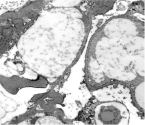 Figure 1B Electron microscopy: Two glomeruli were available for assessment. The podocytes show cytoplasmic vacuolation & 90% effacement of the podocyte foot processes. Mesangial matrix is mildly increased without electron dense deposits. Occasional endothelial cells are swollen but their fenestrations are retained. Tubuloreticular inclusions are not detected. The tubular epithelial cells show cytoplasmic electron dense and clear droplets representing phagosomes with reabsorbed protein and lipid material. Small arteries are not sampled.