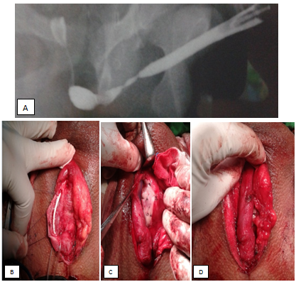 Figure 1 Buccal mucosal urethroplasty for bulbar stricture, A-RUG. B- Mobilization, rotation, and dorsal incision of the urethra. C- BMG was sutured, splayed, and quilted over the corpora cavernosa. D- The edges of the urethra were sutured to the edges of the graft.