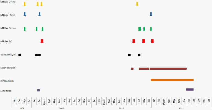 After successfully completing two courses of daptomycin for four weeks and eight weeks respectively, one course of daptomycin and rifampicin for seven months and finally a six week course of linezolid and rifampicin the patient has suffered no further MRSA bacteraemias since early 2011. We have taken the approach that each episode of Gram positive sepsis (whether line related or not) is treated empirically with daptomycin unless there is a defined pneumonic component. We have not been able to demonstrate any daptomycin resistance in any S. aureus isolates from this patient.