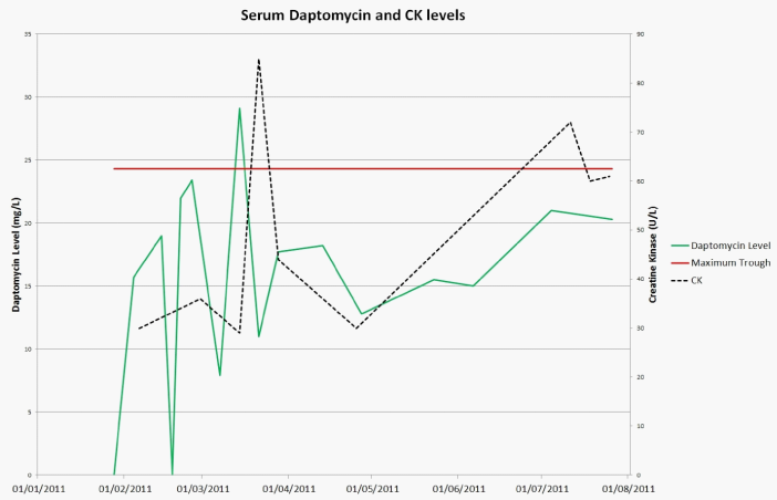She had 3 attempts at AVF formation which resulted in immature fistulas unsuitable for dialysis; she therefore remained resigned to dialyse via a tunneled catheter. To date she has had 4 episodes of MRSA bacteraemia within a period of 24months (Figure 1). The first episode was attributable to MRSA urine infection and the later 3 probably resulted from infected tunneled catheters. The patient is allergic to chlorhexidine so decolonisation treatment was initially delayed, whilst an appropriate alternative was found. After the 3rd episode of bacteraemia she was commenced on Octenisan (an alternative antimicrobial body wash) and silver impregnated dressings were used on line exit site. Antibiotic therapy was switched to daptomycin and therapeutic drug monitoring was undertaken to assess efficacy with serum creatine kinase measurements to detect toxicity (Figure 2). Published studies have indicated that whilst the rises in creatine kinase may be idiosyncratic, levels above 24.3mg/L are associated with increasing toxicity.24 Therapeutic drug monitoring is not currently recommended by the manufacturers.