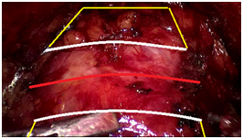 Figure 2 The scheme of prostatic capsule incision (red line - line of incision, yellow and white shapes are boundary of prostatic venous complex and bladder neck).