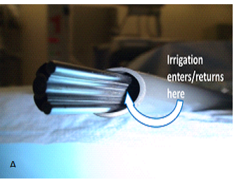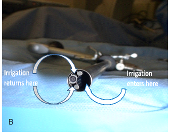 Figure 1 Comparison of space for irrigation inflow and outflow using modified approach. Note the increased space for irrigation outflow with removal of the outer sheath (A) compared with room for outflow with the outer sheath attached (B).