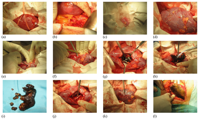 A 40year old male patient was admitted with symptoms of Bi lateral loin pain. Radiological investigations revealed a 1.2cm calculus in the left lower ureter with hydroureteronephrosis and a complete branched Staghorn calculus occupying the entire collecting system with moderate hydronephrosis in the right kidney (Figure 1a & 1b). Routine pre operative investigations including Renal function test and metabolic work up for stone disease was normal. Urine routine showed microscopic haematuria and culture was negative. The patient was first taken up for Ureteroscopy for the left lower Ureteric calculus. The stone was fragmented using Lithoclast and removed and a Double ‘J’ stent was inserted. Two weeks later he was taken up for a Modified Anatrophic Nephrolithotomy for the Right Staghorn Calculus. A preliminary Cystoscopy, RGP and a double J stent insertion was done on the right side. The left side stent previously placed during Ureteroscopy was removed. The patient was placed in the left lateral position and a Rt. loin incision made through the bed of 11th rib excising the terminal segment of the rib. The Gerota’s fascia was opened and the Right Kidney was mobilized completely (Figure 2a). The Renal artery was carefully dissected well away from the hilum to avoid arterial spasm that may occur during dissection close to hilum of the kidney and taped with Vesiloop (Figure 2b). Ice slush was prepared from frozen Ringer lactate solution. A water proof sterile sheet was taken and a central opening made to allow only the kidney to pass through. 100ml of 20% Mannitol was infused quickly. The kidney was turgid and there was a good urine flow. The artery was clamped with an traumatic bulldog clamp. The water proof sheet was placed immediately in the wound and the kidney brought out through the central opening made previously. The prepared ice slush was placed on the water proof sheet covering the entire kidney (Figure 2c). The kidney was cooled externally for 10minutes. After removing part of the ice slush the convex surface of the kidney was exposed. The Renal capsule was incised along the long axis of the kidney 2cm posterior to the convex border of the kidney (Figure 2d & 2e). The renal cortex was bluntly dissected with the handle of the knife towards the collecting system. One small vein that was encountered was suture ligated. The collecting system was opened along its long axis and extended at right angles into the anterior and posterior calyces to completely free the stone. The Staghorn calculus was gently dissected free and removed (Figure 2f & 2g). A small bit of the stone was sent for culture which subsequently was reported as sterile. C-Arm image intensifier was used to assess completeness of stone removal. It showed residual stones in a few calyces. These small calculi were washed out with cold saline with the help of a catheter. Completeness of removal was checked again by C- Arm and also by intra operative Flexible Nephroscopy. The upper coil of the DJ Stent was seen in position in the R Renal pelvis. After ensuring complete stone clearance the renal cortex was loosely approximated with three, 3‘O’ PDS sutures and the capsule closed with interrupted 3‘O’ Vicryl sutures (Figure 2h). The artery clamp was released. The kidney perfused immediately, became pink and turgid with a brisk urine flow seen in the ureter (Figure 2i). There was minimal ooze from the surface which stopped on placing a strip of Surgicel. There was no urine leak from the Nephrotomy site. The total renal ischemia time was 52minutes. The wound was closed with a tube drain after securing haemostasis. In the post operative period there was mild haematuria which lasted for two days. The patient recovered well without any immediate or delayed complications of the procedure. Sutures were removed on the 10th PO day. On the 14th PO day a plain X-ray KUB and an IVU was done. IVU showed bilaterally normally functioning kidneys. There was no distortion, obstruction or contrast leakage on the Right side and the double J stent was in situ (Figure 2J, 2k & 2l). USG confirmed no residual stone in the Right kidney. The patient was subsequently taken up 3weeks later for Flexi Cystoscopy under Local Anesthesia and the Right Double J stent was removed. Patient was asymptomatic and had another USG a week later to confirm that all was well. Patient was stone free. Subsequently a total of Nine Anatrophic Nephrolithotomy has been done so far with comparable results. Complete stone clearance was achieved in 7 cases. Complications in our series-: One patient developed haematuria on the 2nd post operative day which required blood transfusion, but settled with conservative management. All other patients were managed without any transfusion. One patient developed urine leak from the wound in spite of the DJ stent being in situ on the 5th post operative day. Ultrasound revealed a Urinoma posterior to the Kidney. A tube drain was placed into the collection using Ultrasound guidance, for controlled drainage and left in situ for 2weeks. The leak settled without any further intervention and the drain and the DJ stent were subsequently removed. One patient developed wound infection. Cultures were performed and patient treated with appropriate parenteral antibiotics. The wound infection settled and secondary suturing of the wound was performed subsequently. Two patients had small residual calculi which were missed during the initial procedure. These two patients had Flexi Ureteroscopy after 3months and stone clearance achieved (Figure 3).