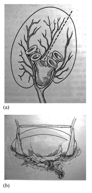 The management of large renal stones occupying the entire collecting system of a Kidney (Staghorn calculus) is a difficult proposition. In the modern era of stone management methods like ESWL and PCNL predominate and are also welcome by patients due to lesser morbidity and quicker recovery. Though these procedures are good and should be the first line of treatment in majority of patients, there are some limitations to these procedures. In cases of multiple large renal calculi and staghorn calculus, ESWL and PCNL may both be necessary to give stone clearance. The patients will require multiple sittings of ESWL with or without PCNL and a protracted convalescence with less than complete stone clearance and the attendant morbidity of passing the stone fragments per via naturalis, in cases where ESWL is used alone. Also anatomical abnormalities like infundibular stenosis cannot be corrected and this leads incomplete removal and early recurrence in such a circumstance open surgical removal of the calculus still has a role to play in selected cases.1 Patients with Staghorn calculus of the kidney commonly present with loin pain, haematuria, fever or in some cases may be asymptomatic. Chronic Urinary tract infection is common in these patients and the typical organisms grown are the urea splitting organisms like Proteus, Klebsiella, Providencia and Pseudomonas. The diagnosis is established by Plain and Contrast radiography and in cases of a Large and almost Radiolucent Staghorn calculus, a spiral Non Contrast CT scan may be necessary to establish the diagnosis. A complete metabolic work up is necessary in the form of Serum and urine Calcium, Phosphorus, Uric acid, Creatinine, Liver function tests including Serum Alkaline Phosphatase and electrolytes and in suspected cases of Hyperoxaluria, Hyperuricaemia or Cystinuria, a serum as well as 24hour urine excretion of Oxalate, Uric acid and Cystine is done. If Hyper Parathyroidism is suspected then a Serum Parathormone and an Ultrasound examination of the neck is done. Anatrophic Nephrolithotomy is a procedure which is done for a complete Staghorn Calculus of the Kidney. It was first described by Smith and Boyce.2 The operation they described was based on the principle of placing the Nephrotomy incision through a plane of the kidney that is relatively a vascular. Thus this approach would avoid damage to the renal vasculature and thereby prevent atrophy of the Kidney, hence the term ‘Anatrophic’. The operation makes use of the fact that the anterior and posterior segments of the kidney is supplied separately by the anterior (apical, upper, middle & lower) and posterior segmental arteries with practically no cross anastomosis between the two segments of the kidney (Figure 4a).Thus the nephrotomy is placed in a plane between the anterior and posterior segmental arteries of the main Renal artery. This a vascular plane was described by Brodel and the surface marking on the kidney is a line drawn on the long axis of the kidney 2cms posterior to the convex border of the kidney not encroaching on to the poles of the kidney (Figure 4b). An Intra operative Doppler probe has been found to be useful during nephrotomy to identify the vessels and prevent injury. The operation also involves reconstruction of the distorted and narrowed part of the collecting system like Calycoplasty, Calyorrhaphy, Infundibuloplasty, Calicocalicostomy etc, thus improving drainage, reducing the likelihood of recurrent infection and stone recurrence.3 An important part of the procedure involves cooling the kidney to reduce the core temperature to 5-10degrees Celsius. This is absolutely necessary as the maximum warm ischemia time of the kidney is only 20minutes. By surface cooling and thereby reducing the core temperature, the allowed ischemia time is increased to 60-75minutes which is adequate to do the procedure without causing permanent ischemic damage to the kidney.4 The ischemic insult is further reduced by infusing 25gms of Mannitol, prior to clamping the renal artery. Mannitol infusion protects the ischemic kidney by promoting post ischemic diuresis and prevents formation of intra tubular ice crystals by increasing the osmolarity of the glomerular filtrate. The immediate complications of the procedure described are bleeding, both intra and post operative, urinary leak, and pulmonary complications like pulmonary embolism and atelectasis. The delayed complications include infection, secondary hemorrhage and recurrence of calculus. Rarely Intrarenal Arteriovenous fistulae formation presenting as delayed haematuria has been observed. In our series there were some minor complications which were managed conservatively. The procedure adopted in our case is a modified one as compared to the original description of Smith and Boyce. These modifications have been described in the literature,5 and were adopted in our cases to reduce the operating time and thereby reducing the ischemia time and subsequent renal injury, and also to reduce complications.