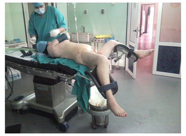 Figure 1 Modified supine position: The flank is elevated 30 to 45° with regard to horizontal plane and lower limbs are split and bent in a lower position.