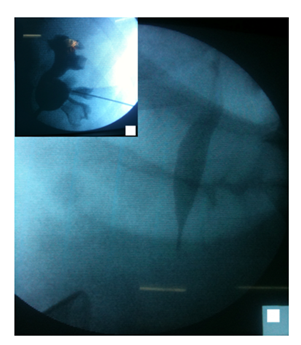 All procedures were carried out under general anesthesia. The patient was placed in the modified supine position. The flank is elevated 30 to 45° with regard to horizontal plane and lower limbs are split and bent in a lower position (Figure 1). The retrograde approach was used initially in all cases. If unsuccessful (Failure to find ureteric orifice or Failure to cross stricture), antegrade or both antegrade and retrograde approach was attempted. The most accessible posterior calyx was punctured under ultrasound guidance using a 22G Chiba needle and the tract dilated to 10 Fr. Radiopaque contrast and Methylene blue were injected into the renal cavity. The renal pelvis, Pelviureteric junction and calyces were identified as the seat and length of the stricture (Figures 2A & 2B). Once the pelviureteric junction was crossed and the ureter accessed, a straight hydrophilic guide wire and a special intrarenal manipulation catheter were used to cross the malignant ureteric stricture (Figure 3). If the stenosis was too tight and that the guide failed to pass, a resection guided with fluoroscopy in the direction of the guide was performed in the same flank modified position. The resection was continued until visualization of the guide and Methylene blue.
