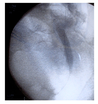 The wire was then advanced into the bladder and preferably harbored with an extracting forceps. This guide wire was then exchanged for an ultra-stiff guide wire. The end of the guide-wire is secured with a clamp at the skin level and the desired steerable stent is positioned under radiographic control in a retrograde fashion over the harbored tip of the guide-wire. Finally, the wire is extracted through the puncture and the stent is released in its correct position. In some cases, dilatation of the ureteric stricture was performed. We used for this purpose an Amplatz sheath, through which progressive increasing size ureteral stents were passed. Applying some tension on the extremities of the guide wire facilitates this maneuver (Figure 4). A final fluoroscopic image was stored to document the stent position. An 8 Frnephrostomy drainage catheter was placed and removed in 48-hours following a satisfactory nephrostogram.