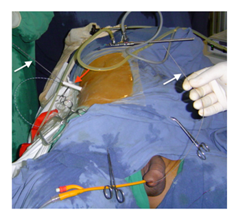 The treatment of ureteral obstruction due to advanced abdominal or pelvic malignancy is a therapeutic challenge. This type of obstruction is usually due to metastatic disease by direct tumor compression of the ureters (cervical bladder, prostate or colorectal), extrinsic compression from expansion of the retroperitoneal cavity (retroperitoneal soft tissue or sarcoma) or encasement of the ureters with metastatic lymph nodes.1 The optimal management of such obstruction resulting from advanced malignancy remains unclear.2 The finding of ureteral obstruction due to malignancy is an ominous sign with a resulting median survival of 3 to 7 months.3 Progressive obstructive uropathy may likely lead to clinical manifestations, such as uremia, electrolyte imbalances and persistent urinary tract infections, if obstruction is not bypassed.4 Percutaneous nephrostomy has been traditionally used to provide temporary or long-term urinary drainage for patients with impassable ureteric strictures. This procedure has major disadvantages for long-term use because there is a need for regular changes, the catheters often get dislodged and/or blocked, and the external drainage with catheter and bag often contributes to an impaired quality of life for the patients.5 Managing extrinsic compression of the ureter by retrograde stenting is first-line therapy but involves a guarded decision because stent failure occurs in nearly half of the treated patients.6,7 Because this high level of failure and the high rate of complications of permanent nephrostomy, our study proposes a novel position that allows easier stenting via combined and simultaneous antegrade and retrograde access of the obstruction.