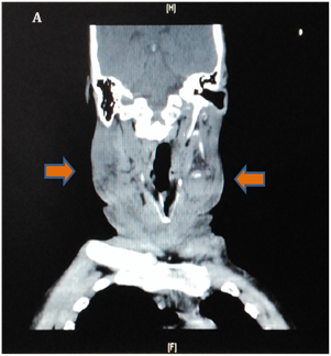 Ultrasound of the neck showed evidence of supraglottic edema, a finding that is confirmed by a computed tomography (CT) scan that confirmed supraglottitis and soft-tissue gas. Leukocyte count was 36 x 103/mm3, and anion gap measurement indicates metabolic acidosis. After stabilization by administration of intravenous fluids and antibiotic agents, the patient was transferred to the operating room, where drainage and cleaning of the anterior neck and floor of the mouth space was done through 3 incisions: two submandibular & one submental. Blood clots and necrotic tissues were optimally removed, tracheostomy was not indicated. The wounds were closed with drains. Four days later, an additional drainage procedure was performed because of an infected fluid collection, and complete dental extraction was done. Patient was discharged in a good condition and at basal graft function.