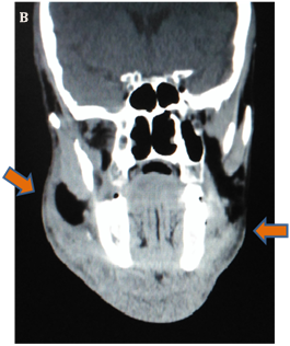 The diagnosis is mainly clinical, patient usually shows a volume increasing hard to palpation in the sublingual, submandibular & submental region bilaterally, which can extend in many times to the suprahyoid region, leading to elevation of the oral floor & tongue [8,9]. Elevation of the tongue is associated with risk of airway obstruction, dysphagia, odynophagia, dysphonia and cyanosis. Signs & symptoms characteristic of infectious processes are observed: high fever, malaise, anorexia, tachycardia and chills [10,11]. Computed tomography is the most complete resource available because through both the axial/coronal cuts and differentiation of the density of soft tissues, it can provide more accurately the dimensions and localization of the infection areas [12]. According to Fogaca, the clinical examination is decisive for the diagnosis of Ludwig’s angina: however, it must be added by a complete anamnesis, image examinations and laboratorial tests. The laboratorial tests, such as complete blood picture, renal function, culture and antibiotic sensitivity test, are also of vital importance to monitor the general state of the patient and to determine the microorganisms involved to define the antimicrobial therapy.
