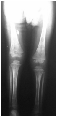 Blood count analysis showed leukocytosis (12800) and 153000 platelets. 7.6g/dl hemoglobin and 24.1% hematocrit. PCR: 34.32mg/L and ESR 76. Albumin: 3.45. Radiographic examination of the lower limbs visualized bone rarefaction of femurs, tibias, and fibulas (Figure 1).