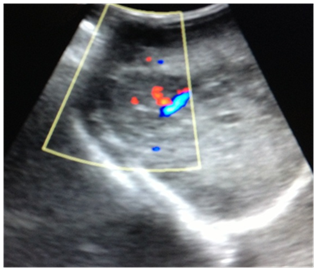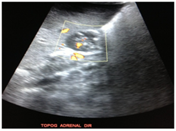 At abdominal ultrasonography, it was noted heterogeneous image, irregular, ill-defined, with Doppler vascularity in the right hepatic lobe (Figure 2). It is also visualized, at the right adrenal region a rounded image of imprecise limits, predominantly hypoechoic, with calcifications and Doppler vascularization, measuring about 3.7x2.1 cm in its largest axis (Figure 3).