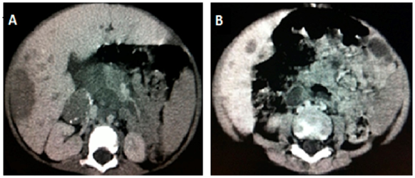 Abdominal CT scan demonstrates multiple rounded formations, predominantly hypodense, well delineated, showing heterogeneous impregnation after the infusion of intravenous contrast, especially one in the right hepatic lobe measuring approximately 11.0x8.3x6.4cm. It was also noted left perihilar para-aortic lymphadenopathy and interaortocaval lymphadenopathy with a confluent aspect and an expansive formation, ovoid, heterogeneous, predominantly hypodense with calcifications inside, measuring about 3.7x2.2 cm in its major axis in the right adrenal (Figures 4A) (Figure 4B).