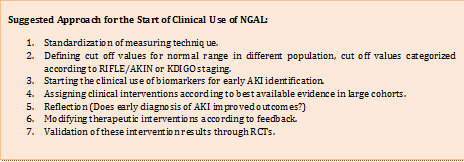 Furthermore, biomarkers like NGAL are able to distinguish causes of AKI (increase in ATN, Normal in pre-renal AKI). Also, therapeutic intervention for early AKI couldn’t be applied early except after detecting and defining early AKI even before urine output decreases or creatinine increases. In summary, NGAL is emerging as an early, sensitive biomarker in the field of AKI. Strong evidence has been provided for the predictability of NGAL in a variety of AKI settings. NGAL should start to pave its way into clinical practice (suggested approach for NGAL start of use in clinical practice is summarized in (Figure 1). Benefits of such a diagnostic tool will surely exceed the costs for its implementation. And advancements in nephrology practice will certainly take place with the routine use of NGAL.