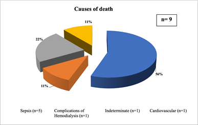 The clinical, epidemiological, social and economic characteristics of the patients are described in Table 1. The majority of children and adolescents (82%) were incidents on RRT, which means that they did not come from another dialysis center. The mother was the main caregiver in most patients (80.5%). Among all patients evaluated, 54 were school-age patients and 46 (85%) reported attending school regularly. As demonstrated in Figure 1, primary glomeronephritis was the main underlying disease, followed by the Congenital Anomalies of the Kidney and the Urinary Tract (CAKUT). During the study period, nine patients died. The causes of death are described in Figure 2. The main cause was sepsis (56.0%).