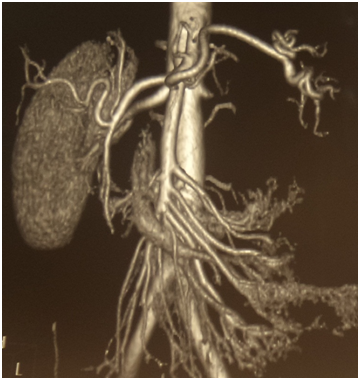 After 4months of antiviral treatment his CRP was now elevated up to 98mg/L, he developed mild leukocytosis (WBC 10.4x109/L), his thrombocytosis persisted, and his serum creatinine raised to 150µmol/L. Ultrasound now found left kidney shrinkage with renal blood flow reduction and left epididymis enlargement; right kidney and right epididymis were otherwise normal. He was suspected with left testicle neoplasm; however his LH, FSH, estradiol, progesterone, prolactin, testosterone, ACTH, cortisol, aldosterone, AFP, PSA and free beta HGC were all normal. Antiviral treatment was discontinued, and he underwent contrast-enhanced abdomen CT and CT-angiography, which showed pseudo-aneurism of the left artery, left artery proximal occlusion and reduced left kidney excretory function (Figures 1 & 2). Eleven months after his first presentation he was referred to our hospital and admitted to the vascular surgery.