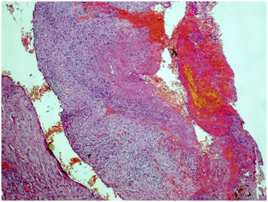 Figure 3 Renal artery wall is extremely thickened due to severe irregular sclerosis and hyalinosis, with disorganization of layers and broken wall integrity. In the lumen, there is fresh thrombotic masses connected to the wall and presented by fibrin, erythrocytes, and small clumps of hemosiderophages. Hematoxylin & Eosin, x40.