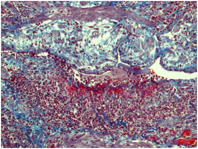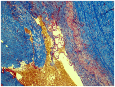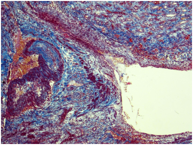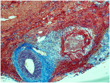 Figure 5 Kidney. The wall of a large caliber artery is markedly thickened, forms pseudoaneurismal widening and shows histological architecture disturbance due to the following: edema, dense transmural and perivascular infiltration presented by neutrophilic leukocytes and histiocytes, and irregular coarse fibrosis. Nearby the wall of a medium caliber artery demonstrates severe irregular focal fibrosis with total occlusion of its lumen. Masson’s trichrome; x40.