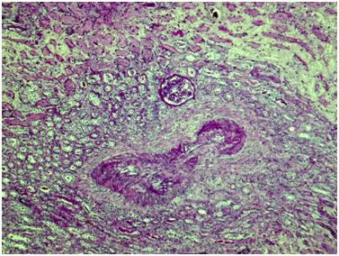 Kidney: Arterioles and small arteries walls otherwise normal. Middle arteries walls are diffuse thickened due to the fibrous connective tissue with impaired histoarchitectonics of the wall layers and subtotal limen obstruction. Large arteries walls are thickened due to edema, massive transmural and perivascular infiltration with neutrophils and histiocytes, and irregular fibrous connective tissue with impaired histoarchitectonics of the wall layers. Multiple pseudo-aneurisms in the zones of large arteries bifurcation with the severe edema and prominent walls infiltration. Multiple cortical macrofocal ischemic and hemorrhagic renal tissue necrosis. Preserved renal tissue presented by normal glomeruli. Total acute tubulonecrosis without tubular atrophy or interstitial fibrosis (Figures 5 & 6).
