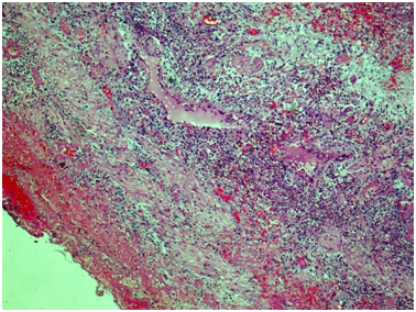 Ureter: Erosive-ulcerouslesions of mucosa with massive fibrino-leucocyte excaudate. Ureter wall is thickened due to the severe edema and massive leucocyte infiltration of all layers; with multiple intramural necrosis and prominent neutrophil karyorhexis. Small, medium and large arteries walls are thickened due to the irregular neutrophil infiltration, with circular fibrinoid necrosis of small and medium arteries walls; and focal impaired histoarchitectonics and integrity of large arteries walls due to severe infiltration; with multiple pseudo-aneurism formation. Diffuse severe fibrous periureteritis with massive fibrin deposition and leucocyte infiltration with prominent karyorhexis (Figures 7-9).