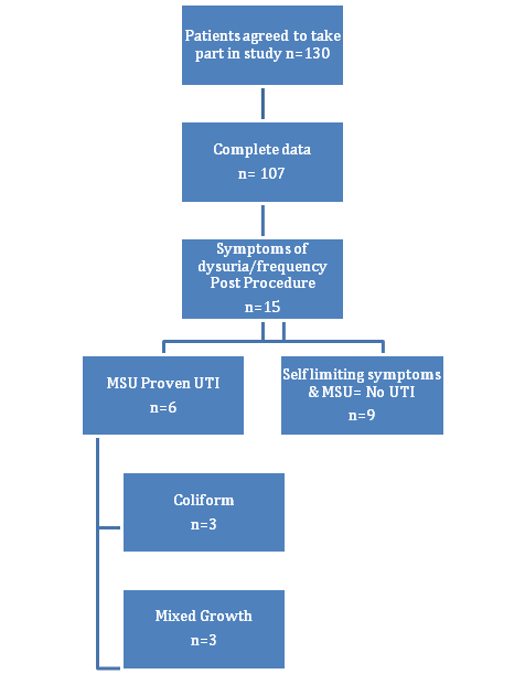 They were advised to fill the questionnaire and send it back to Urology department 1 week after the procedure. Patients were provided with self-addressed and stamped envelope to send back the questionnaire. One hundred and thirty patients agreed to take part and we obtained complete data on 107 patients. MSU culture results confirming UTI were faxed to General Practitioners as they were received from microbiology department for patient assessment and antibiotics prescribing in primary care. Those results were faxed as high priority and also an urgent letter was sent.