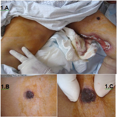 Figure 1 On the left leg, a well-demarcated and large ulcerated lesion [1.A]. In comparison, [1.B & 1.C] the lesions on the left leg are those in the early changes of calciphylaxis and show typical picture of gangrenous lesion typical of calciphylaxis.